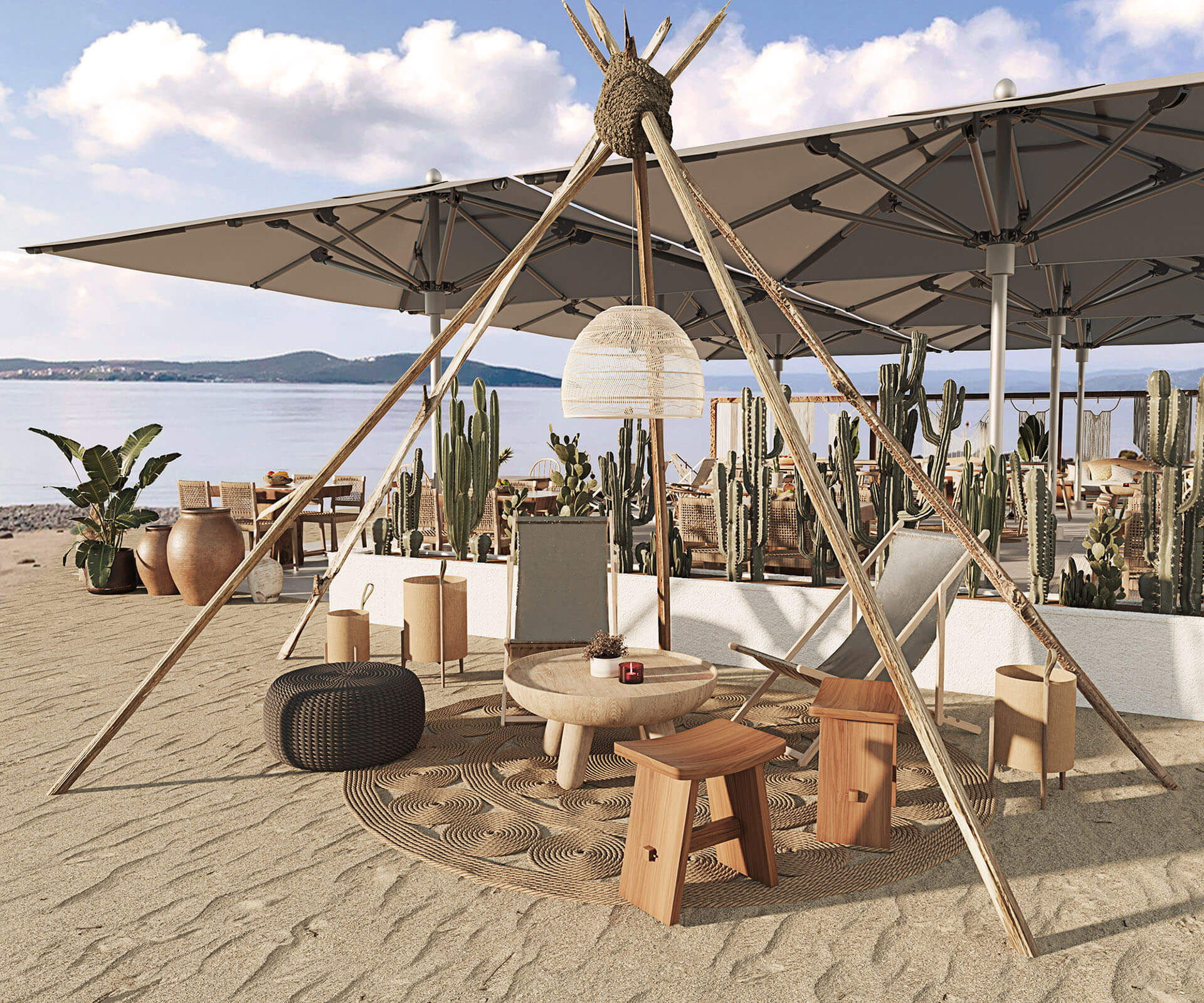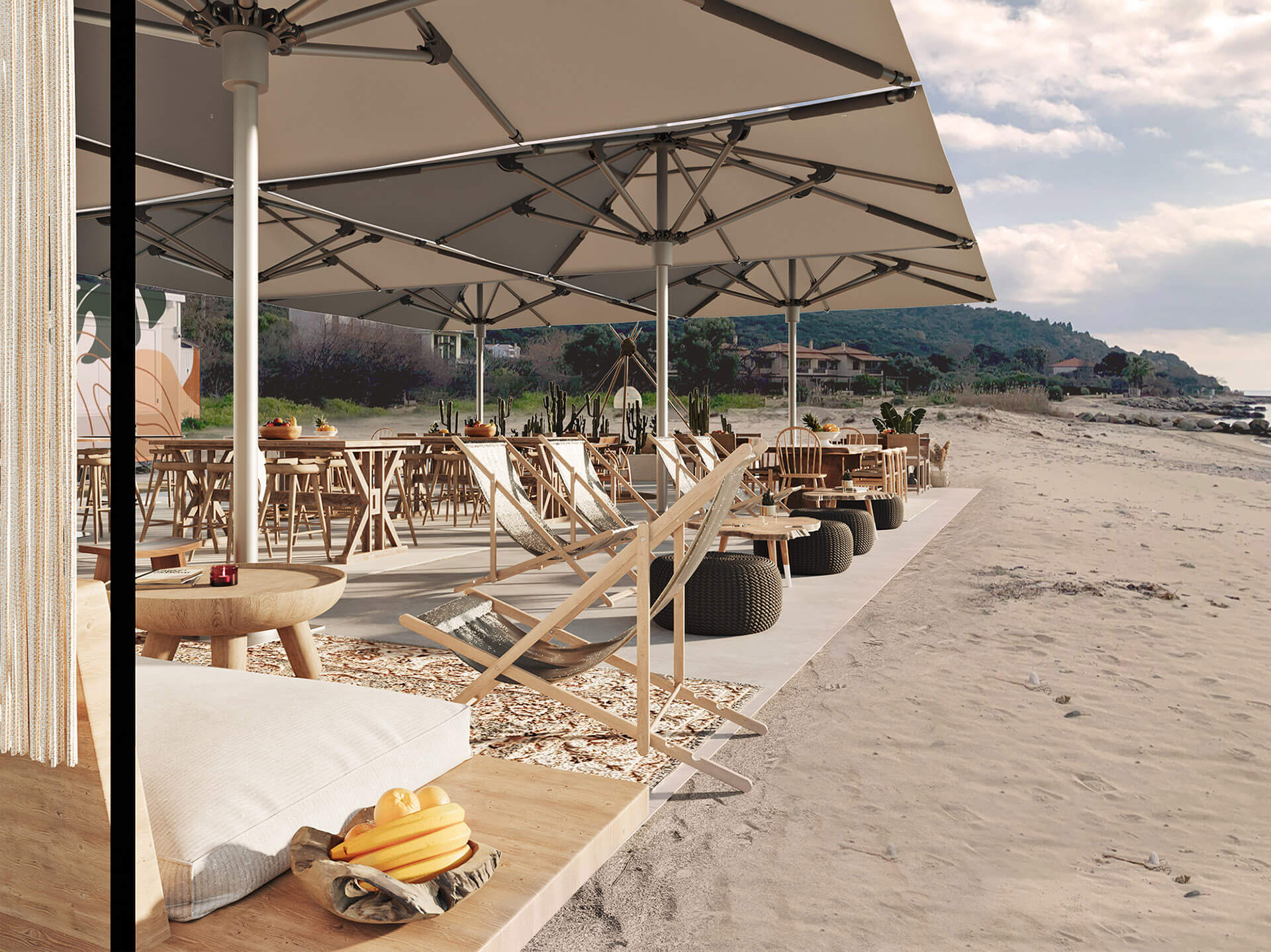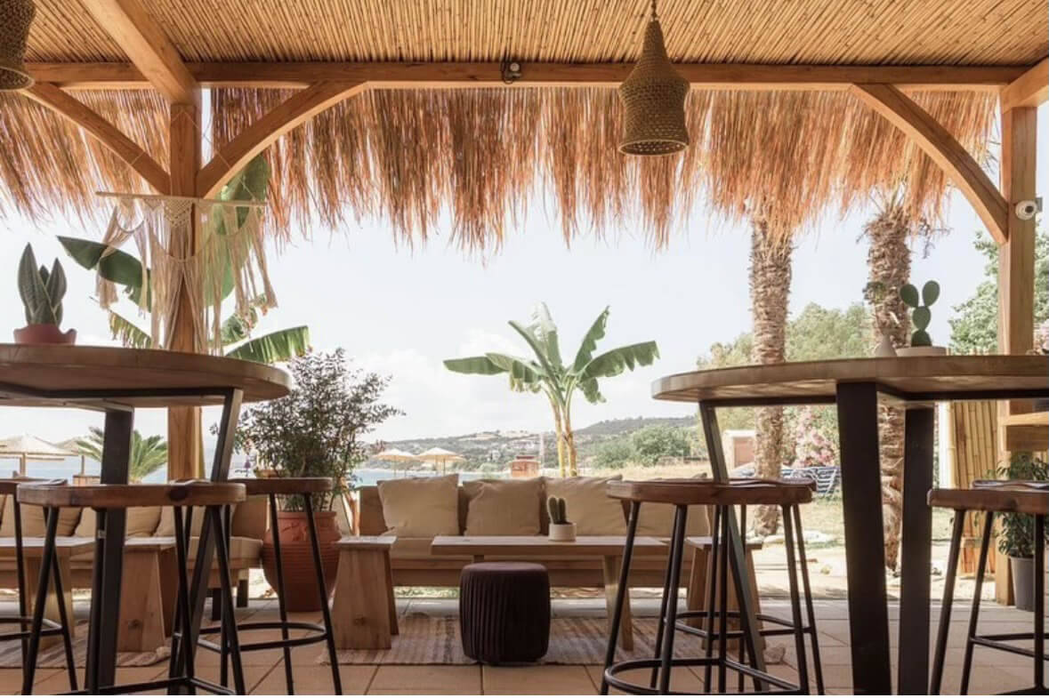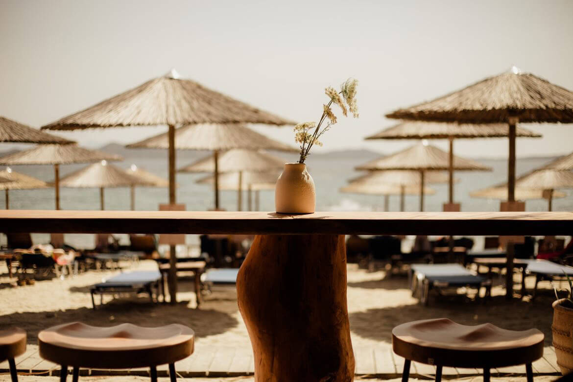 A beach front, drinks and dining area with a twist was asked to be designed in Ouranoupolis, Chalkidiki. We tried to incorporate natural elements, and offer a diverse seating area for all times of the day; from enjoying drinks, to having a cosy dinner and to enjoying the sun in a bathing suit. The use of wood and lounge items, create the best mood to sit and enjoy pleasant summer moments.