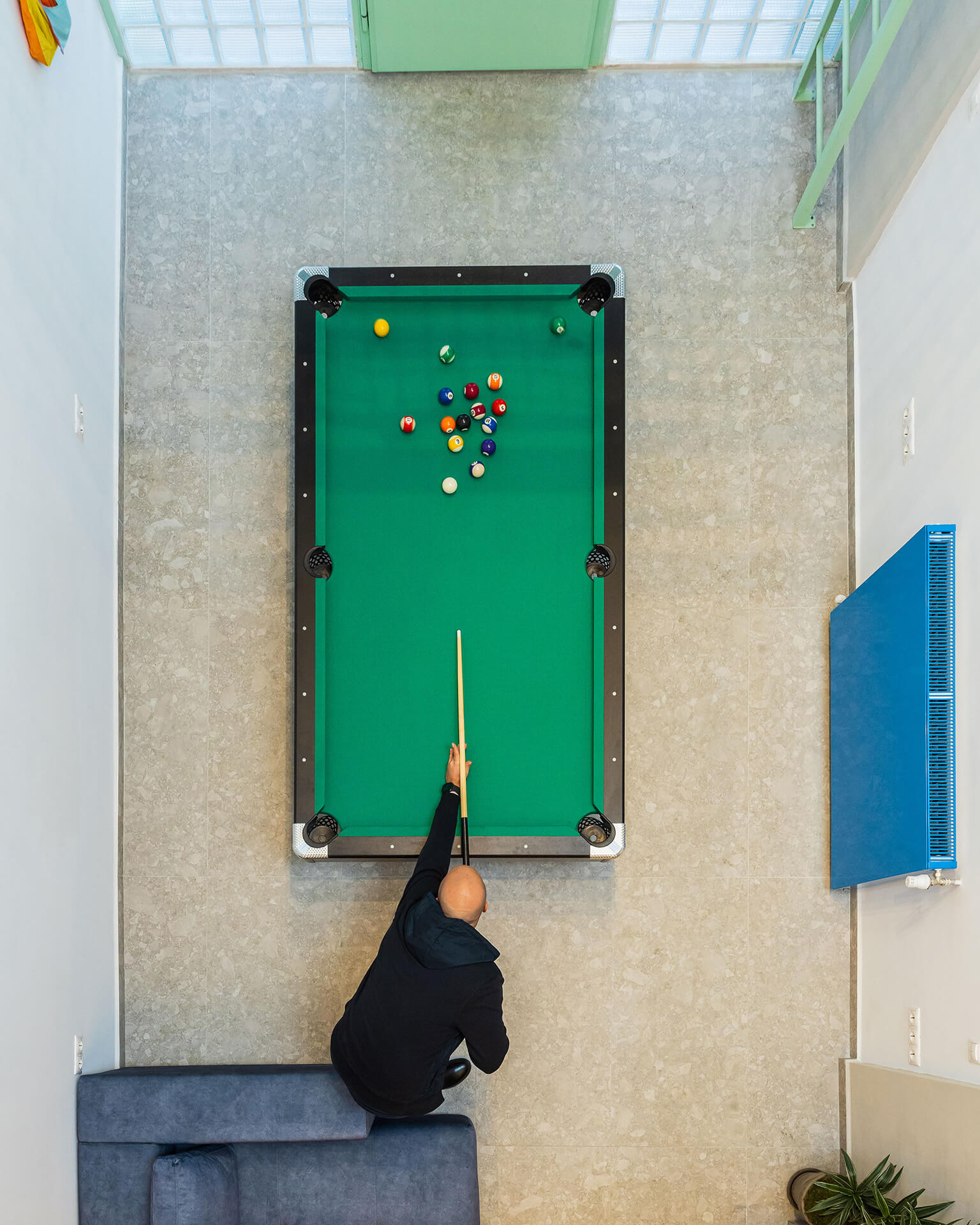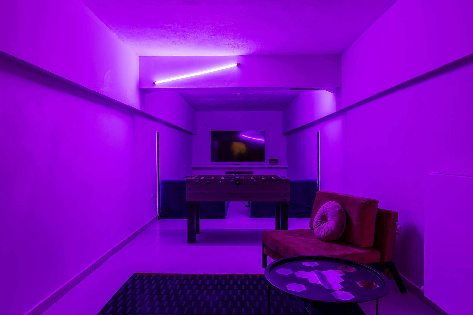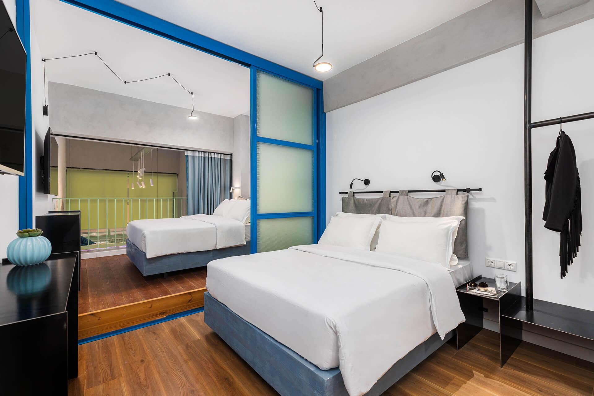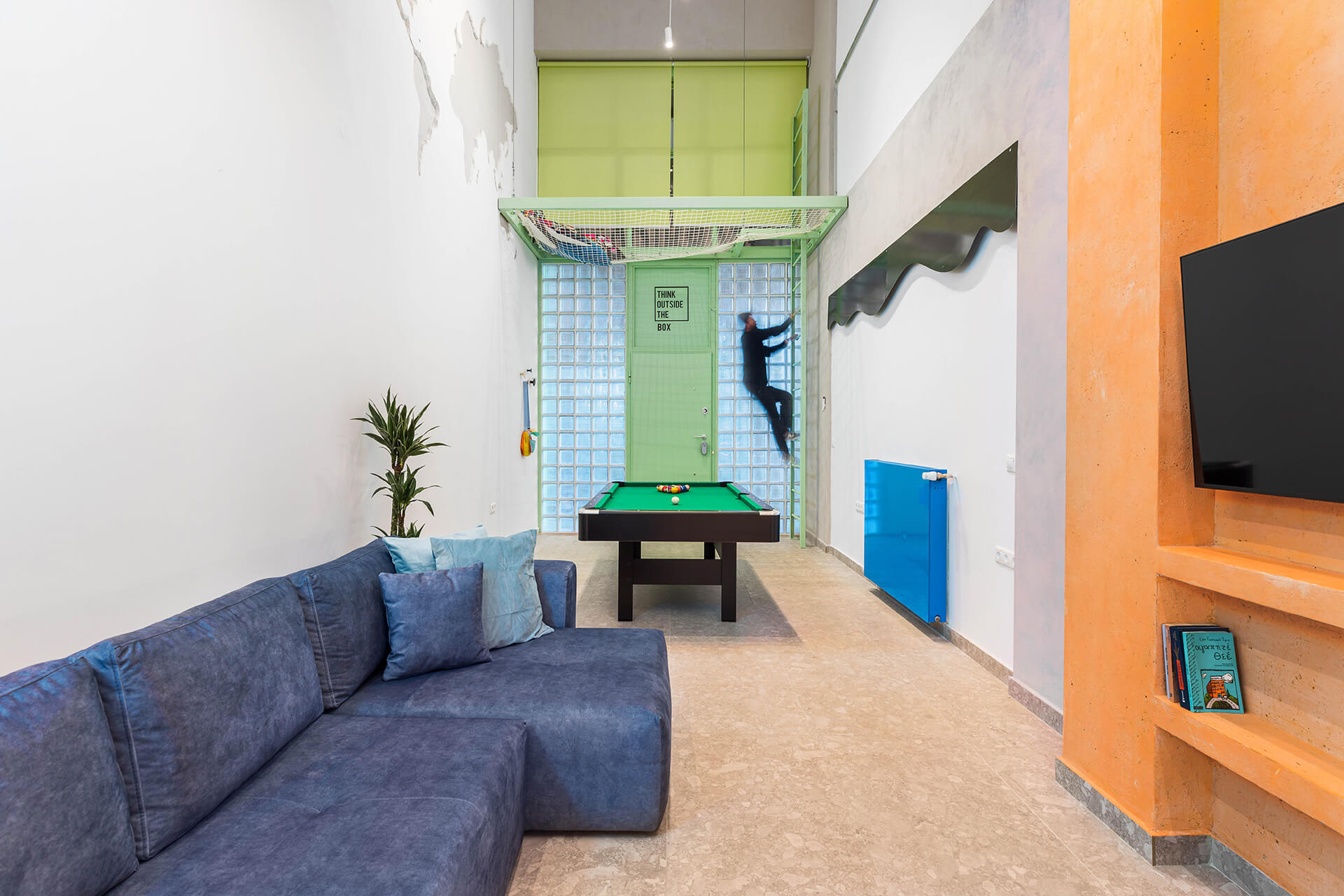 What used to be an all day café bar is now a rental unit in downtown Thessaloniki. The primary goal of this project was to maximize design appeal and the functionality of all spaces within, in order to be able to accommodate the maximum number of potential users, creating a multi-functional space with open plan design, ideal for parties and events. Our main target was to redesign the ground floor façade of the property, maintaining privacy levels while also making sure that natural lighting and airing are available. This was accomplished by using glass bricks and an electrically controlled, aluminium window. The combination of materials used is what made spaces feel joyful, with a diversity of textures and bold colors, creating a unique experience to the users.