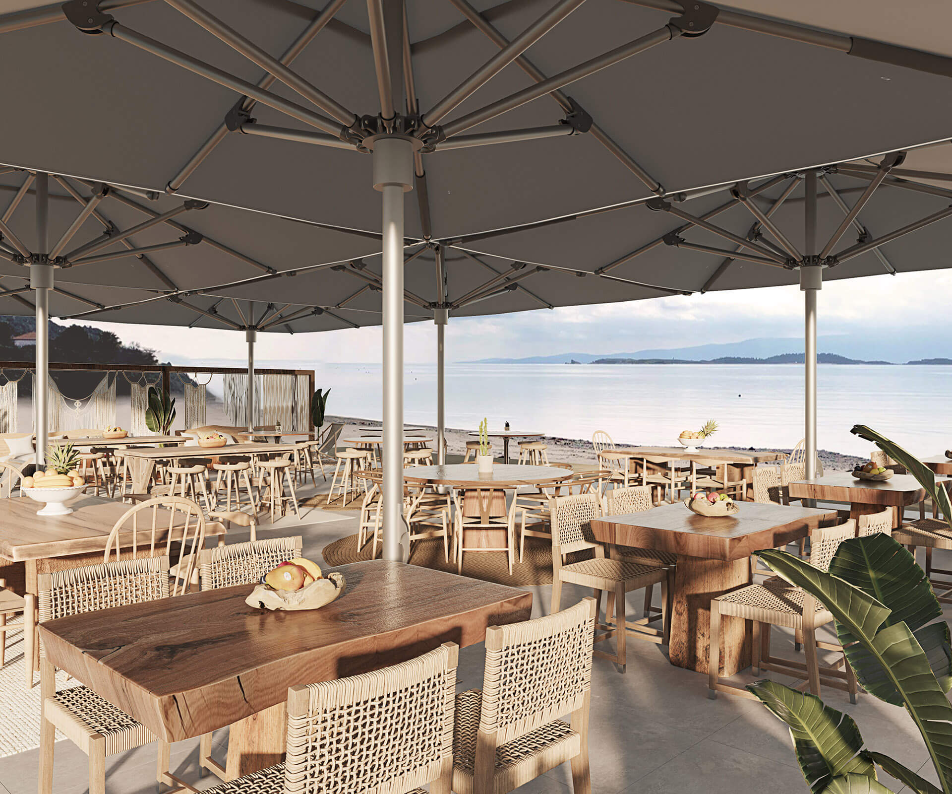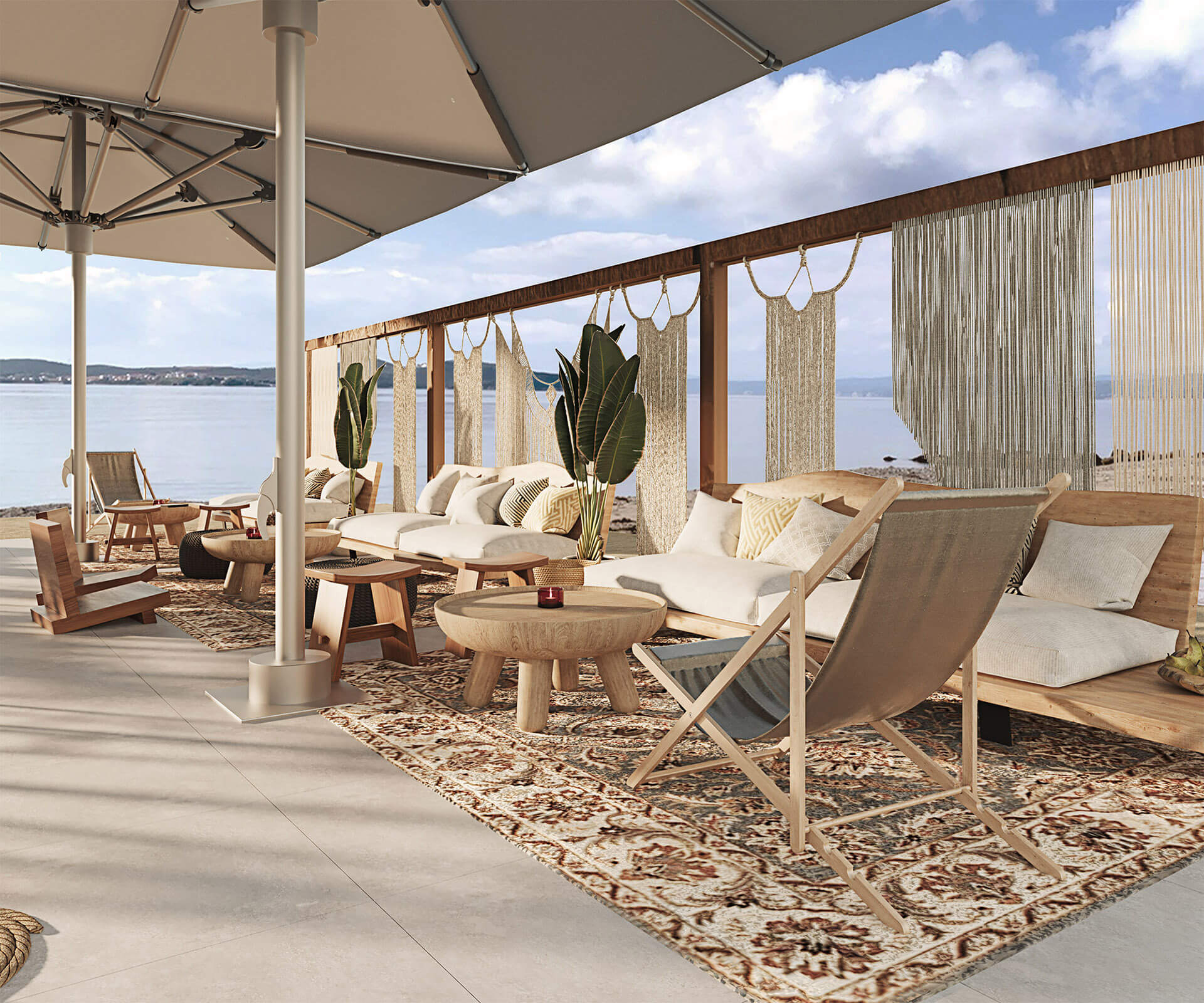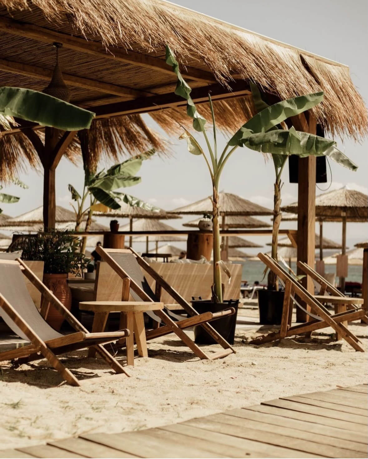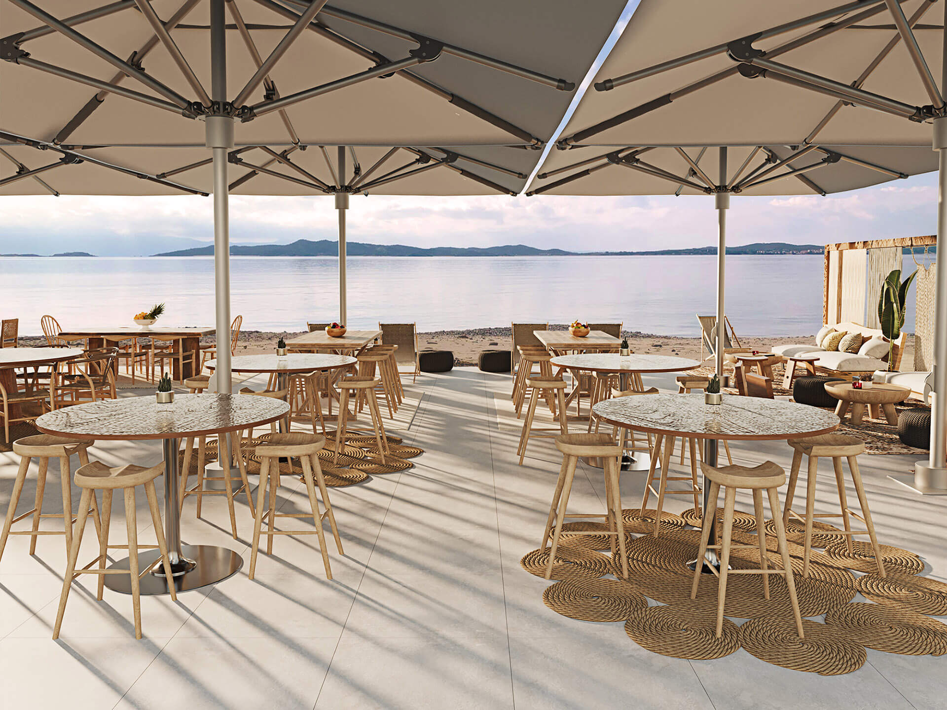 A beach front, drinks and dining area with a twist was asked to be designed in Ouranoupolis, Chalkidiki. We tried to incorporate natural elements, and offer a diverse seating area for all times of the day; from enjoying drinks, to having a cosy dinner and to enjoying the sun in a bathing suit. The use of wood and lounge items, create the best mood to sit and enjoy pleasant summer moments.
