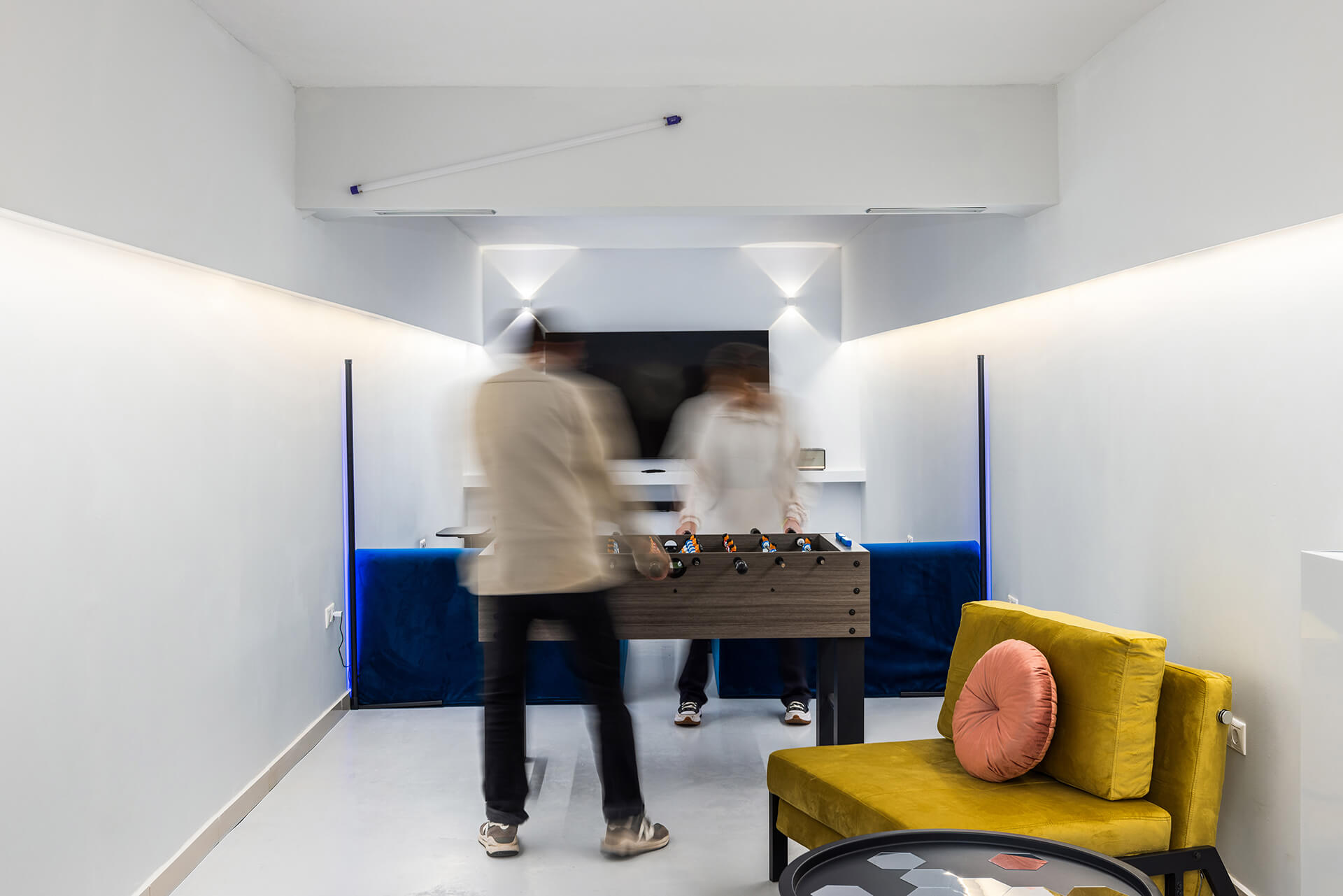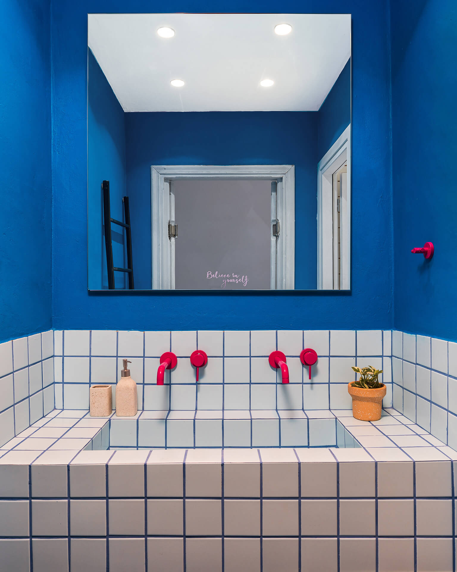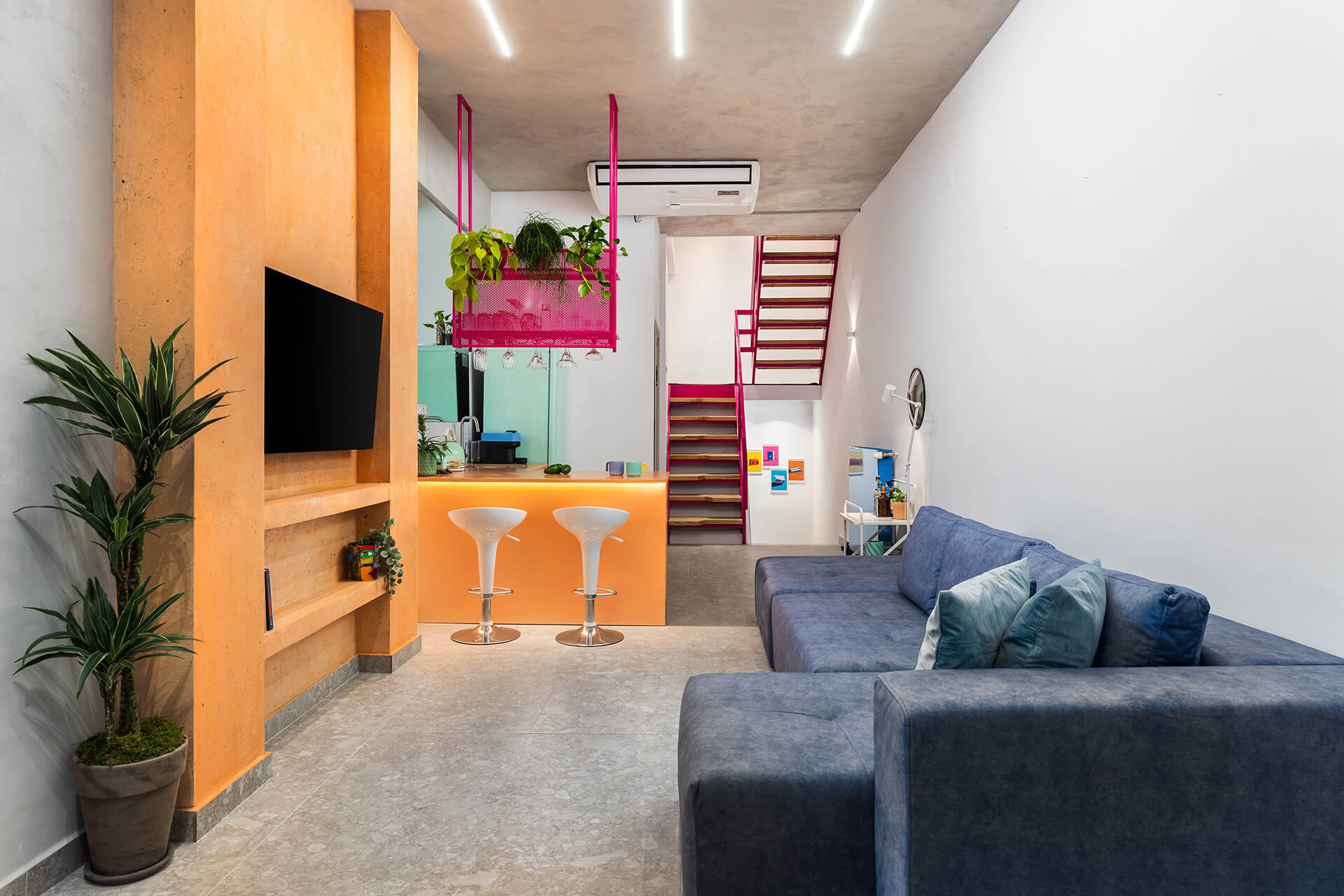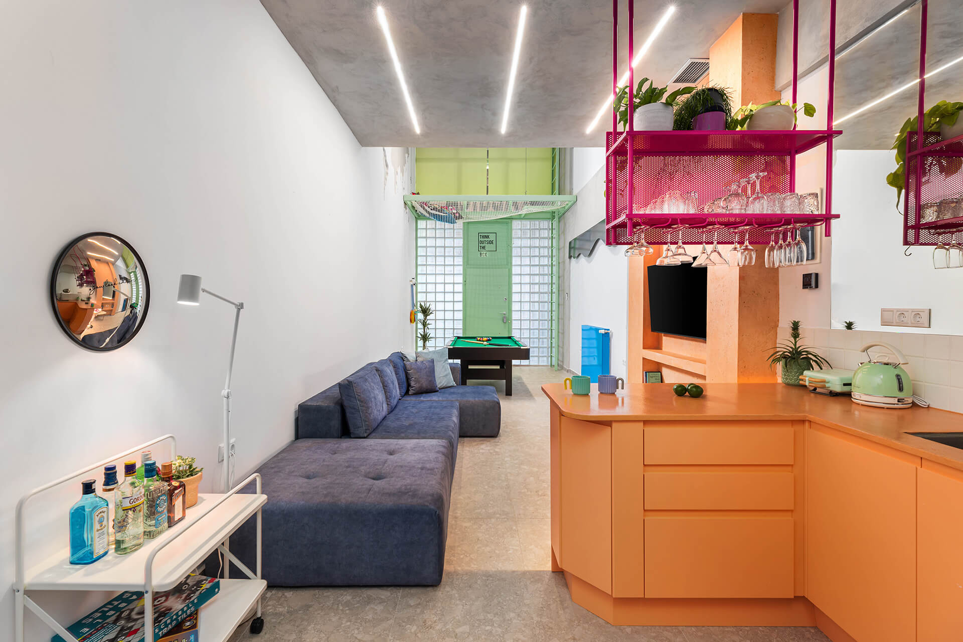 What used to be an all day café bar is now a rental unit in downtown Thessaloniki. The primary goal of this project was to maximize design appeal and the functionality of all spaces within, in order to be able to accommodate the maximum number of potential users, creating a multi-functional space with open plan design, ideal for parties and events. Our main target was to redesign the ground floor façade of the property, maintaining privacy levels while also making sure that natural lighting and airing are available. This was accomplished by using glass bricks and an electrically controlled, aluminium window. The combination of materials used is what made spaces feel joyful, with a diversity of textures and bold colors, creating a unique experience to the users.