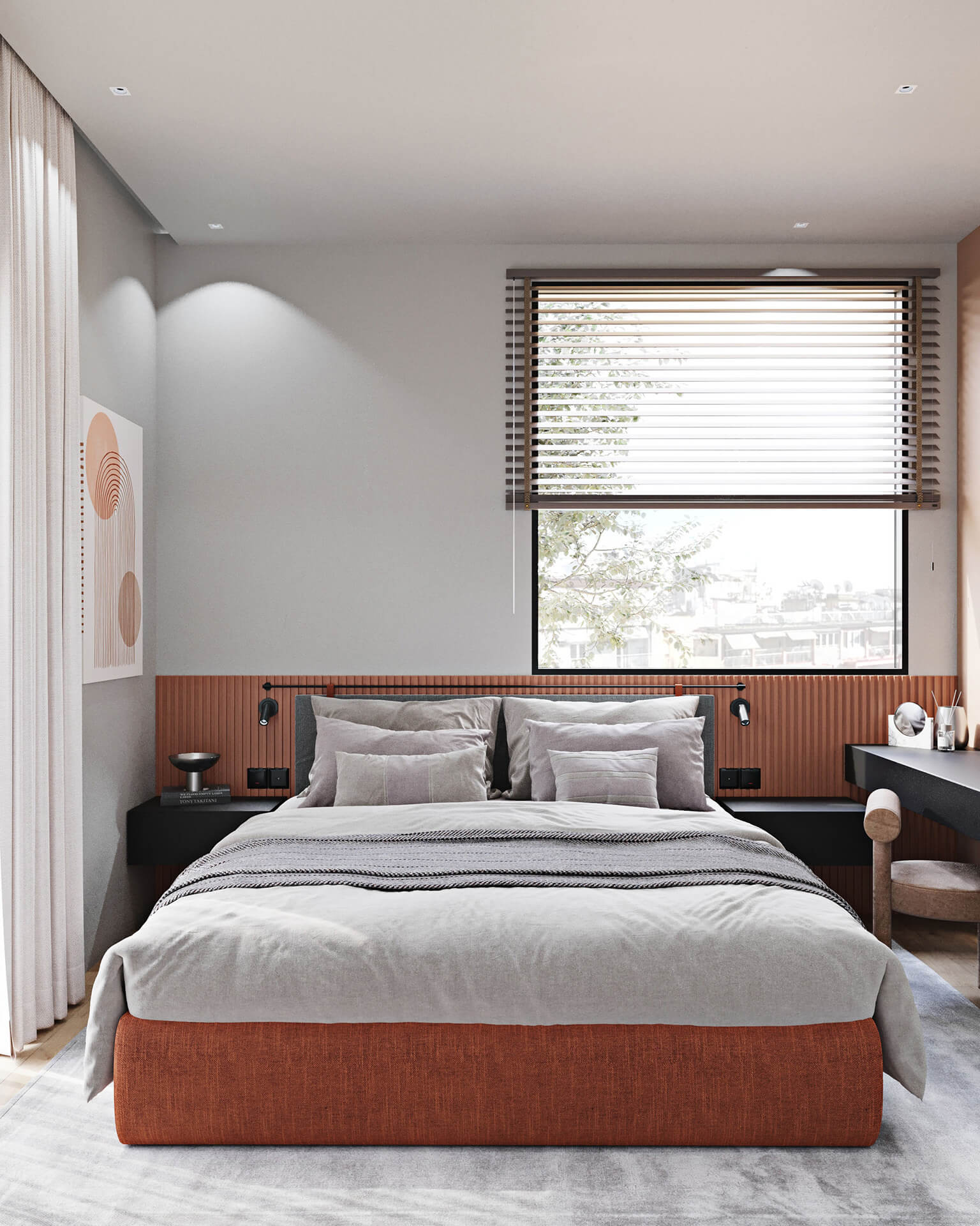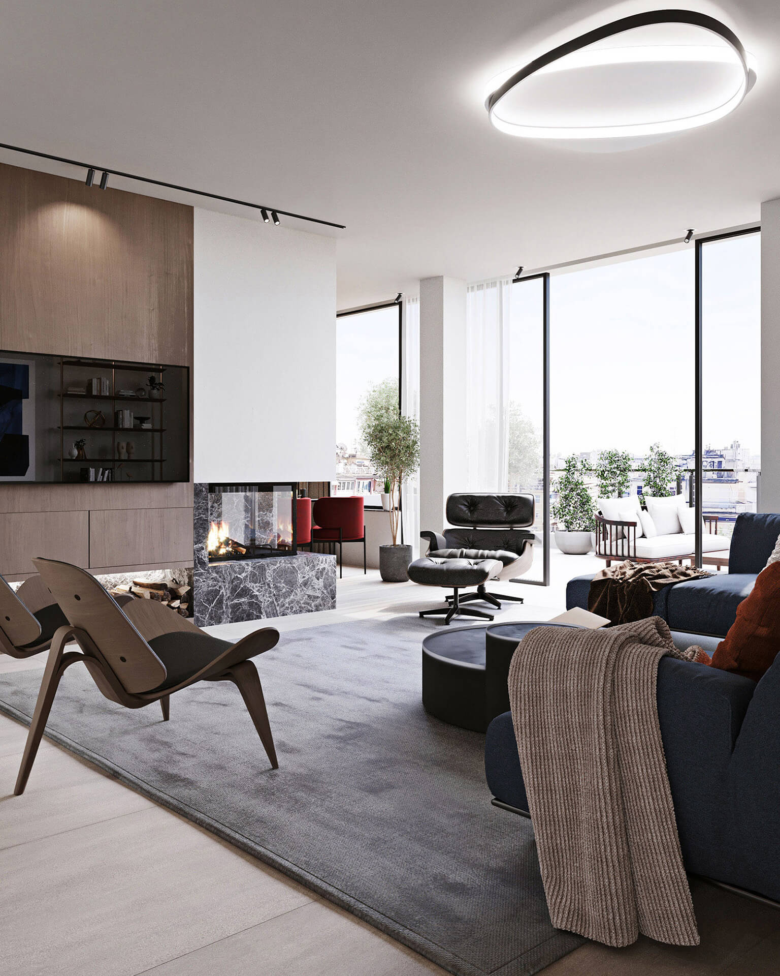A top floor apartment in the city centre of Thessaloniki with a spacious, bright and airy living room. We equipped the flat with underfloor heating, a central, corner fire place and custom aluminium profile windows in order for the users of the property to be able to maintain internal temperatures with low levels of energy consumption. The sliding aluminium windows in the living room was the greatest challenge of the project, since the height of the window opening was at 3,00m and the total length at 9,00m. Being a top floor apartment, there was great risk with the wind pressure that could be created on specific weather conditions. Studying all available profiles with our suppliers and technical department we managed to install a secure window with easy, soft sliding mechanisms, eliminating any problem a window at this specifications would have.